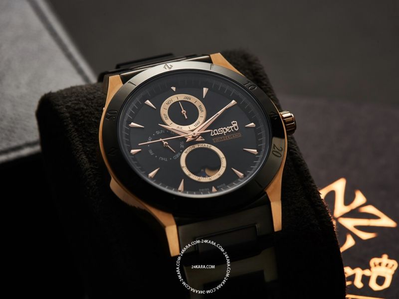 Zaspero SG405-11 có mặt số màu đen huyền bí, dưới góc 12 giờ là một vòng tròn thể hiện lịch tháng, di chuyển xuống dưới ở góc 9 giờ là lịch thứ - lịch tháng và lịch thứ luôn hữu ích trong đồng hồ, đặc biệt hơn trên góc 6 giờ là lịch sun and moon.