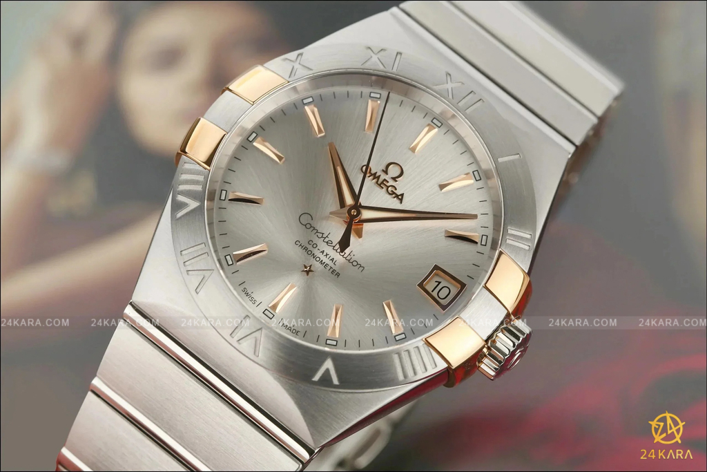 Chiếc đồng hồ Omega Constellation 2009 này sở hữu mặt số màu bạc với cửa sổ ngày ở vị trí 3 giờ và mặt kính sapphire chống xước. Viền bezel, cọc số la mã và móng vuốt được làm bằng vàng sedna 18K, gắn trên vỏ 38mm làm từ thép không gỉ.