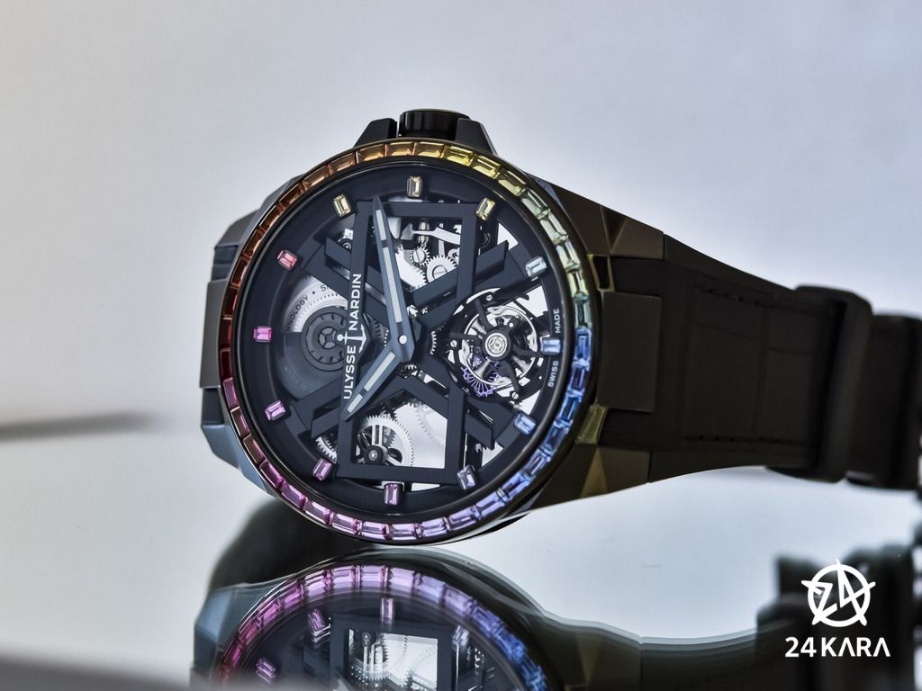 Trên mặt số khung xương của đồng hồ cũng được đính 12 viên đá quý đầy màu sắc đóng vai trò là cọc số chỉ giờ. Hình chữ X đặc trưng nằm bên dưới hình chữ nhật được gia công mở cho thấy bộ máy tourbillon tự động của Ulysse Nardin mang tên Calibre UN-172.