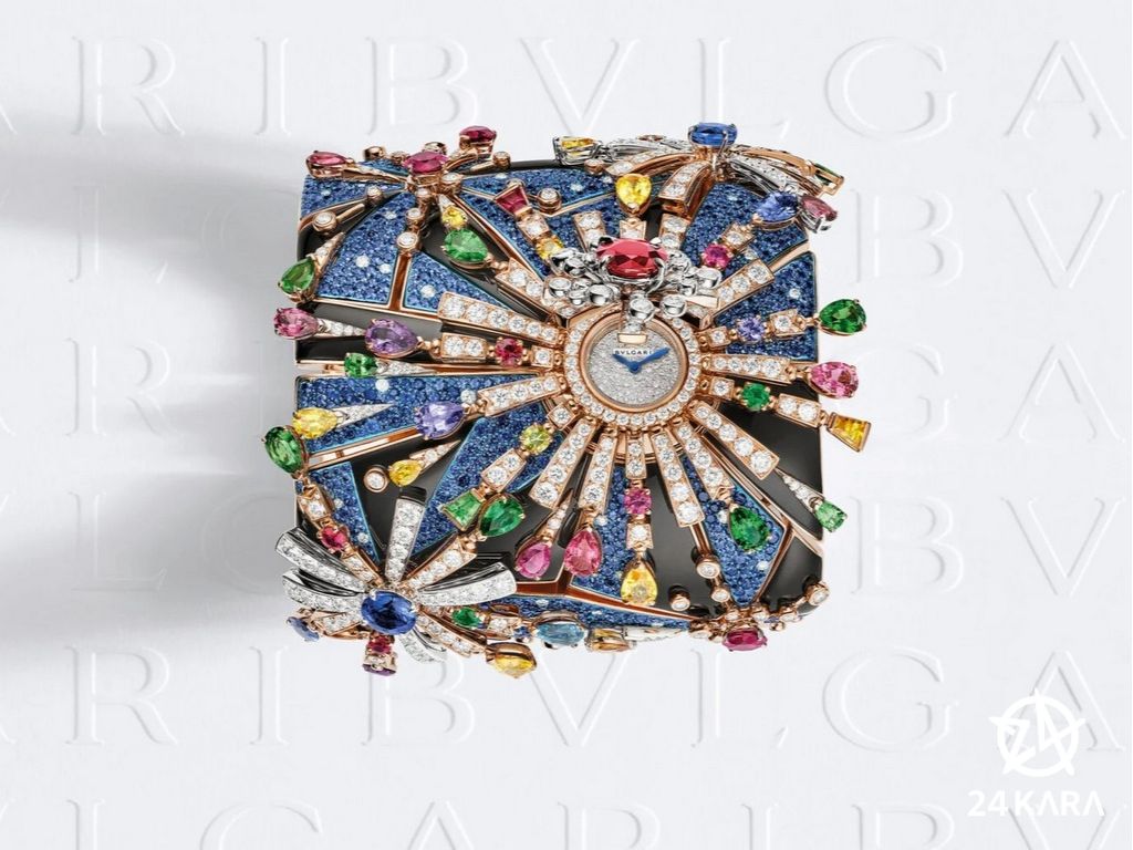 Trung tâm của những bông pháo hoa là chiếc đồng hồ bí mật đính kim cương hình mặt trời được bảo vệ bởi một viên hồng ngọc lớn 2,93 carat và được cung cấp năng lượng bởi bộ máy lên dây cót thủ công Piccolissimo của Bulgari.
