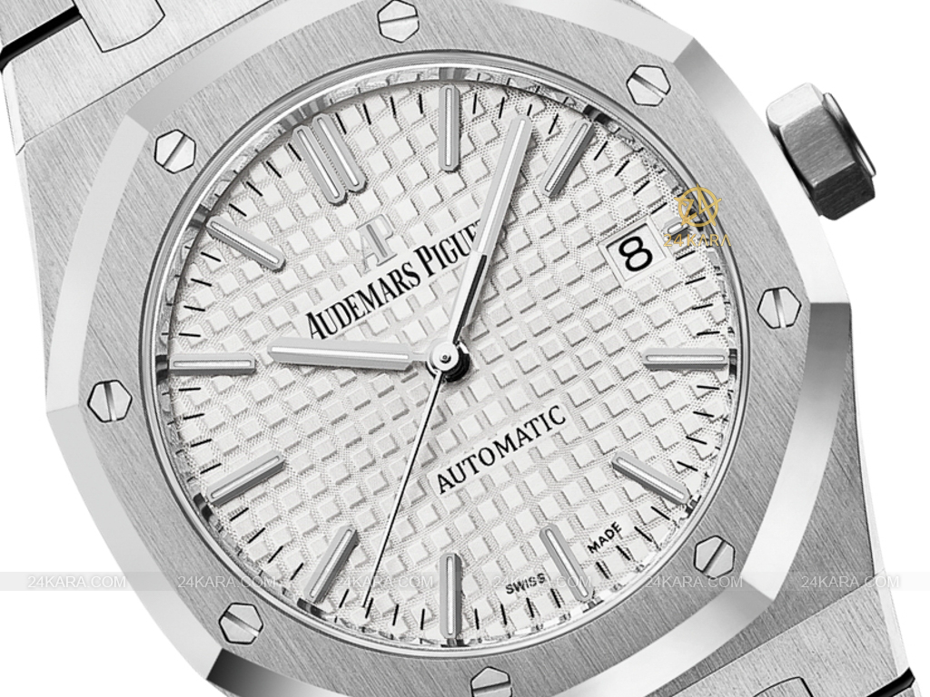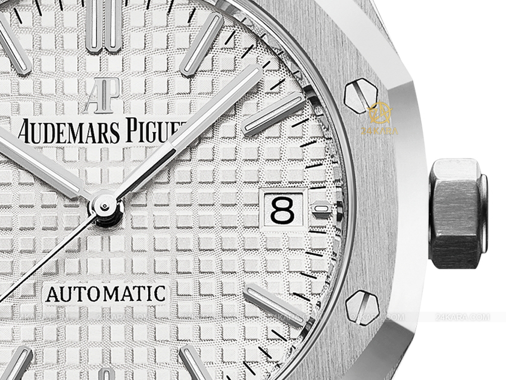 Kim giờ và kim phút kiểu Royal Oak được làm bằng vàng trắng và phủ lớp dạ quang, giúp người dùng dễ dàng quan sát thời gian ngay cả trong điều kiện thiếu sáng. Vạch chỉ giờ cũng được chế tác bằng vàng trắng tạo nên sự hài hòa và cao cấp cho toàn bộ mặt số.