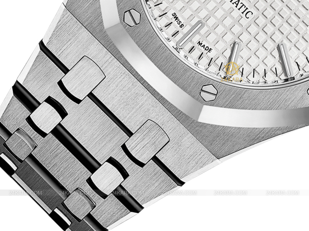 Kích thước mặt số 37mm và độ dày chỉ 9.8mm mang lại sự vừa vặn hoàn hảo trên cổ tay, đặc biệt phù hợp với người dùng yêu thích sự gọn gàng nhưng không kém phần đẳng cấp. Vành bezel bát giác đặc trưng với 8 đinh ốc lục giác bằng vàng trắng giúp nhận diện dễ dàng dấu ấn Royal Oak danh tiếng.