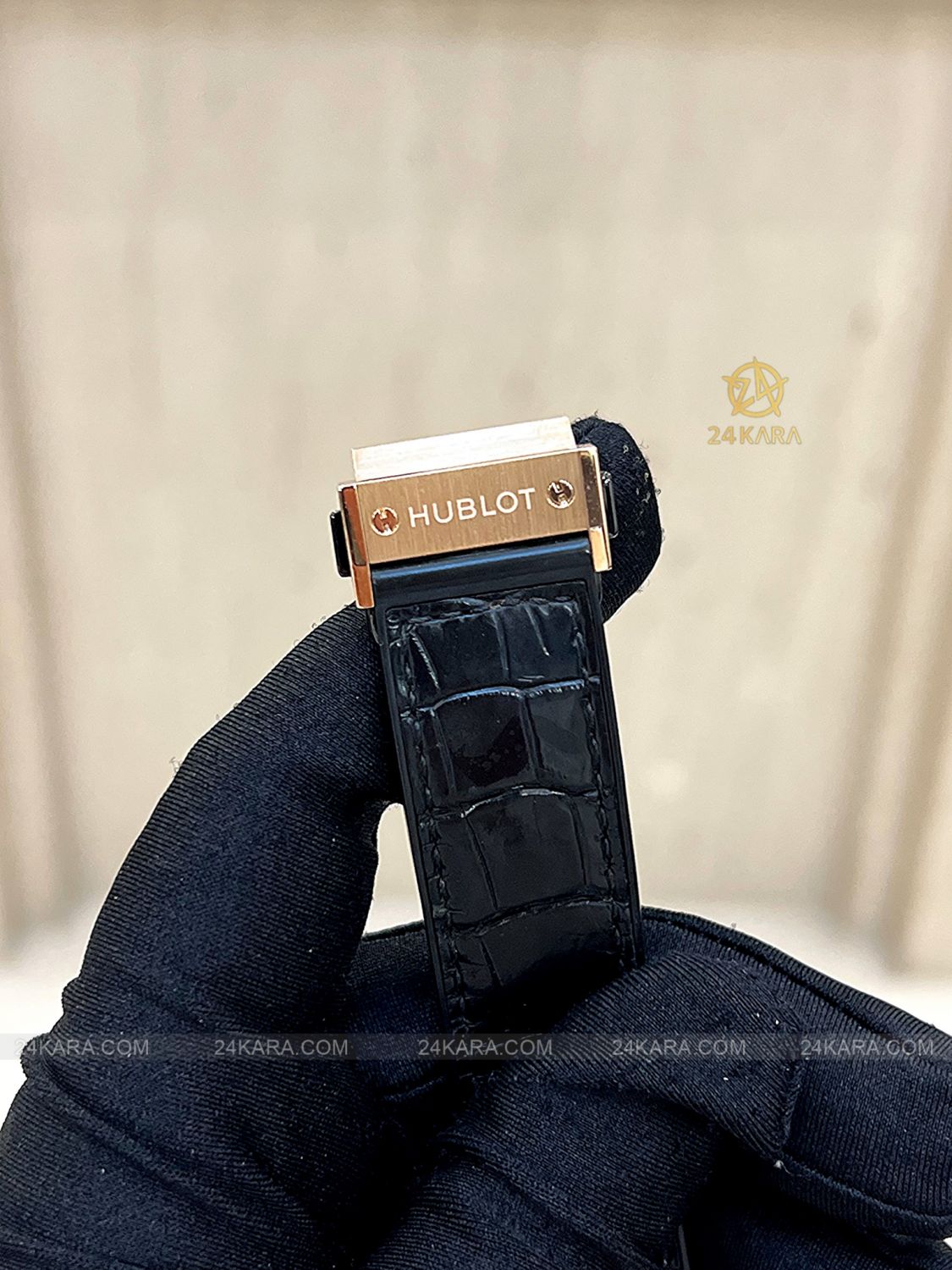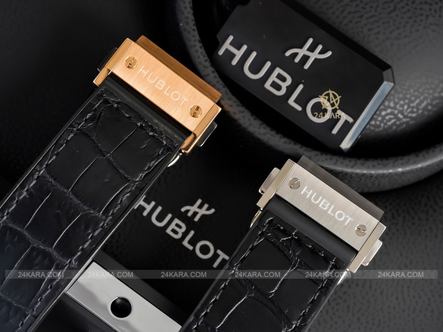 Bên cạnh cọc số và kim index, kim giây mảnh của đồng hồ có phần đối trọng là logo chữ H quen thuộc của Hublot. Ở góc 3 giờ là một ô cửa sổ ngày nền đen chìm xuống dưới mặt số với chữ màu vàng hồng. Góc 12 giờ là logo cùng tên thương hiệu Hublot.