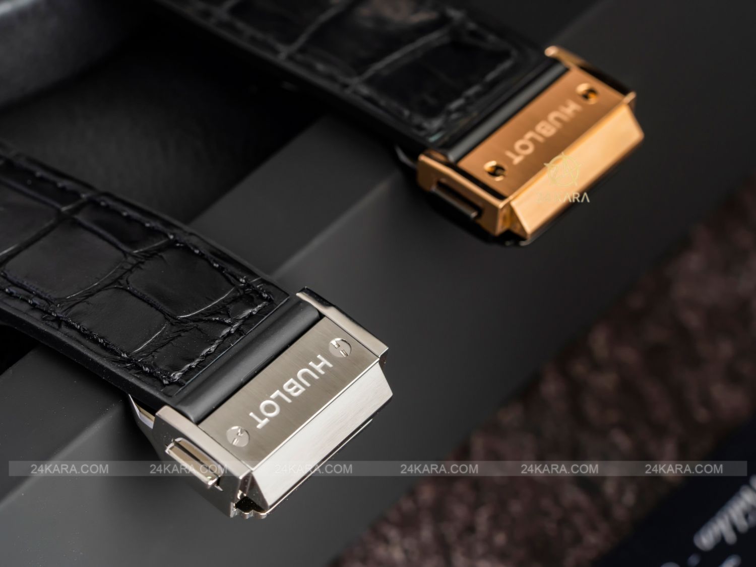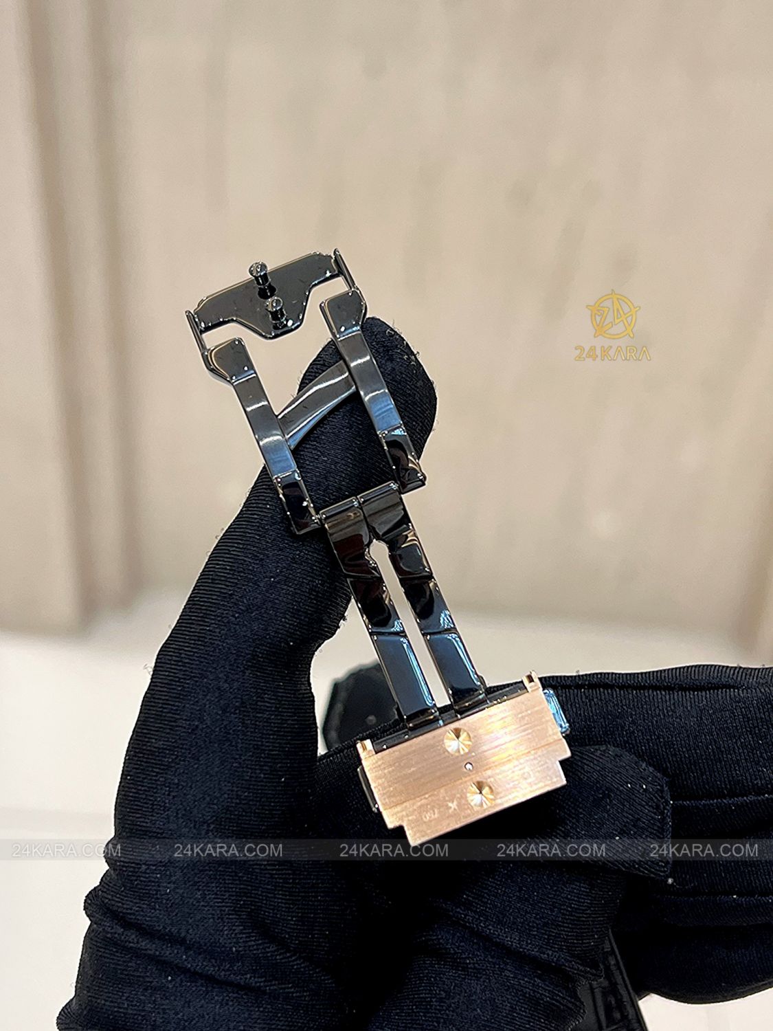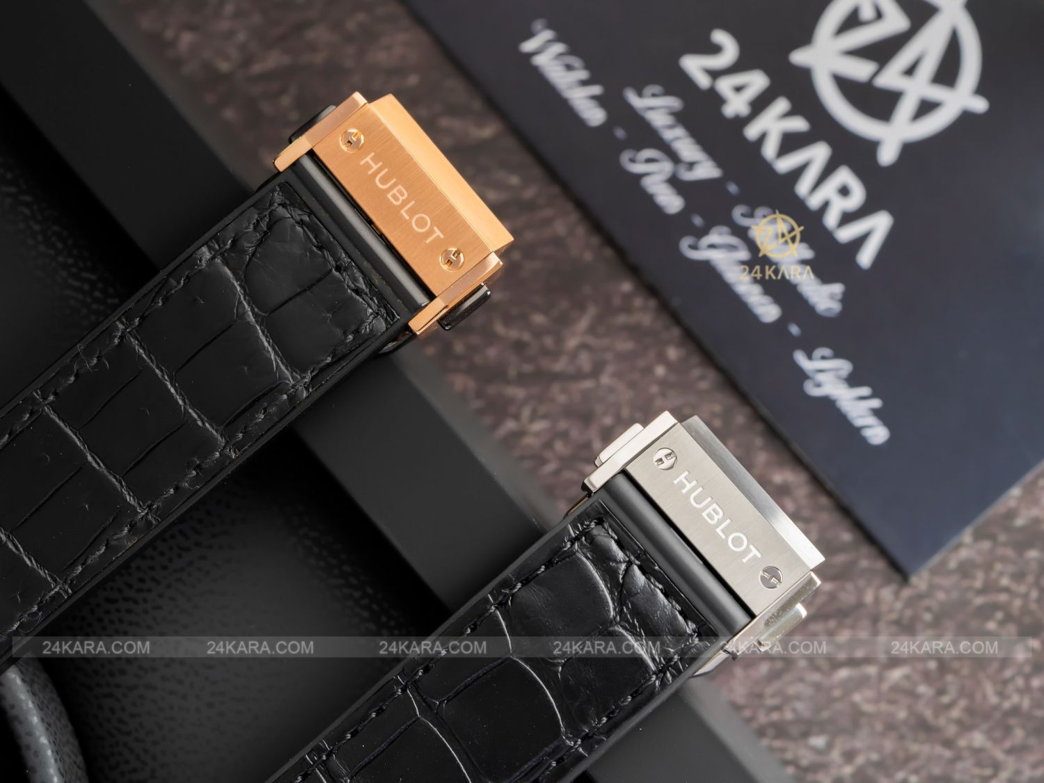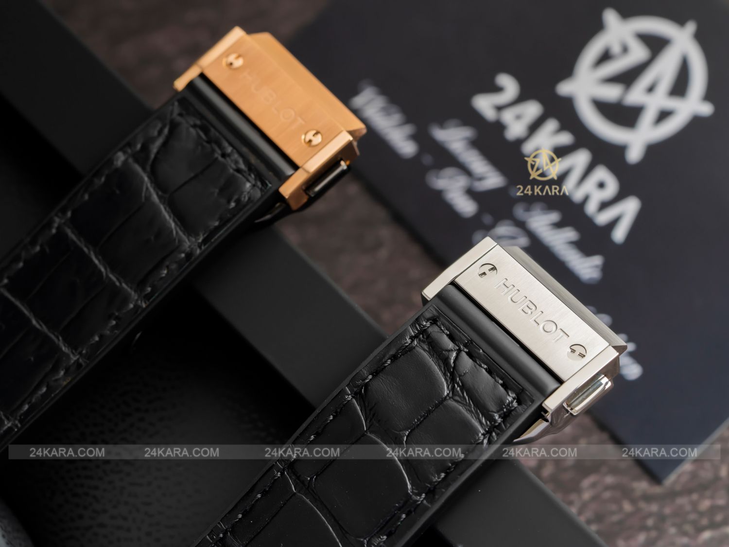 Đồng hồ Hublot Classic Fusion 542.OX.1181.LR.1104 đi kèm với dây đeo lõi cao su bọc da cá sấu cao cấp bên ngoài, bộ dây là sự giao thoa giữa độ bền bỉ và sự sang trọng của một sản phẩm đồng hồ cao cấp. Bộ dây được nhuộm đen đi kèm với khóa clasp vàng 18K 5N và thép không gỉ mạ đen cho một tổng thể màu sắc cân đối, bắt mắt.