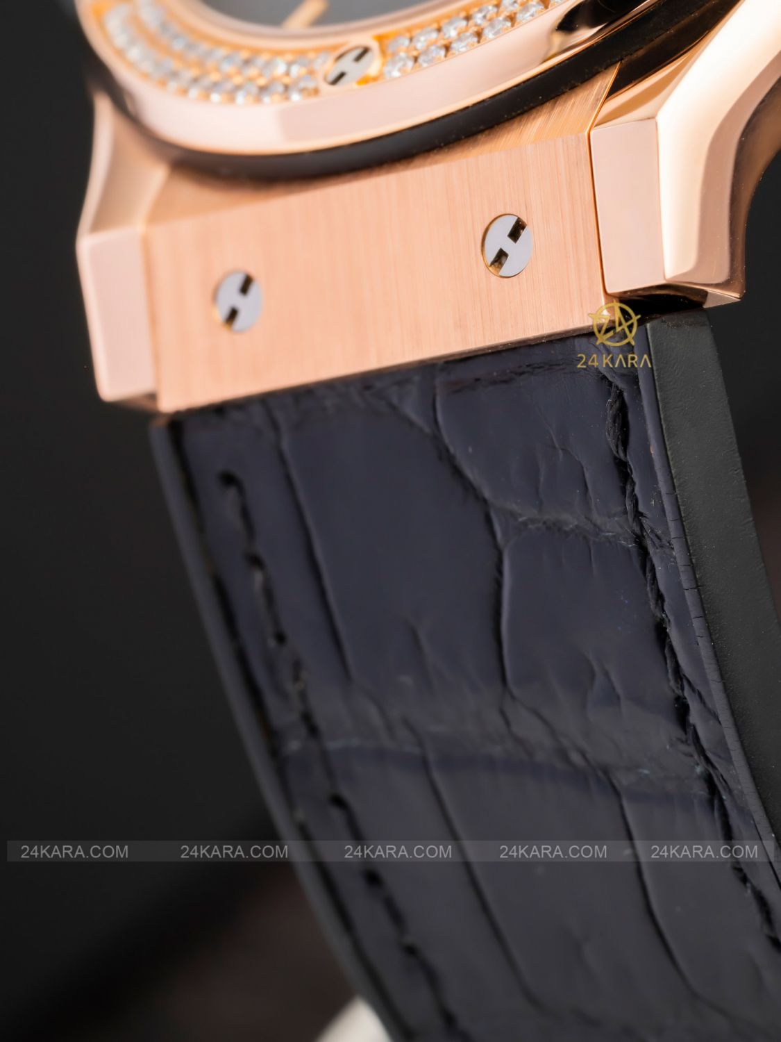 Không dừng lại ở đó, như để nhấn mạnh thêm vẻ ngoài lấp lánh và đẳng cấp, Hublot đã nạm viền bezel của chiếc đồng hồ này với full kim cương. Tổng cộng có đến 138 viên kim cương được cắt sáng lấp lánh đính trên viền bezel, với tổng trọng lượng là 0,89 carat.