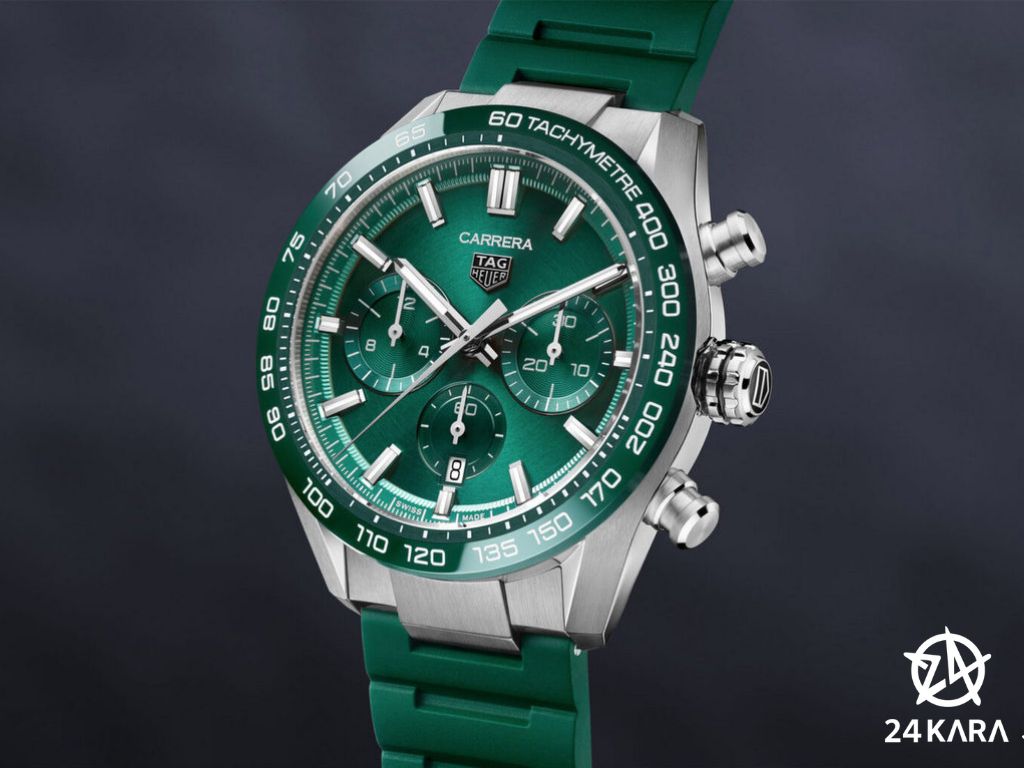 Tông màu xanh lục trên đồng hồ TAG Heuer Carrera Chronograph 44mm cũng có điểm khác biệt so với phiên bản trước đó, cụ thể là thương hiệu đã sử dụng tông màu lạnh hơn trên viền bezel và mặt số đồng hồ. Vỏ đồng hồ có khả năng chống nước ở độ sâu đến 100m và được bao bọc bới 1 lớp kính sapphire ở cả 2 mặt.