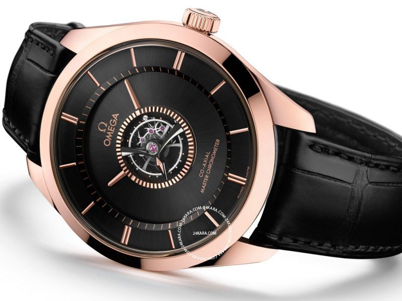Phiên bản Omega De Ville Tourbillon Numbered Edition này như một sự trở lại với bố cục đối xứng ấn tượng. Chúng tôi sẽ tiết lộ một điều cho các bạn sau lớp màn màu đen của mặt số, đó chính là một lớp vàng khuyên khối. Đúng vậy, bạn khá bất ngờ đúng không? Ngay cả mặt số của đồng hồ cũng được làm từ vàng nguyên khối Sedna, chỉ là sau đó được mạ PVD sang màu den, điều này đang trở thành xu hướng trong thời gian gần đây. Khi nhìn vào mặt số, bạn sẽ không thể rời mắt khỏi chi tiết Tourbillon ấn tượng, xuất hiện cùng đó là hình ảnh chiếc kim giây được vát bốn cạnh đặt ngang trên cầu Tourbillon. Ngay cạnh đó, là một vòng tròn được mạ vàng, khắc thành từng khía nhỏ biểu tượng cho vạch chia giây rất độc đáo. Hai kim giờ và kim phút cũng được mạ vàng, đặt đối xứng nhau tạo nên một cái nhìn hoàn toàn mới lạ. Các vạch số của đồng hồ được khắc nổi mạ vàng hồng vừa tạo hiệu ứng tương phản tuyệt đẹp, vừa giúp bạn quan sát thời gian dễ dàng.
