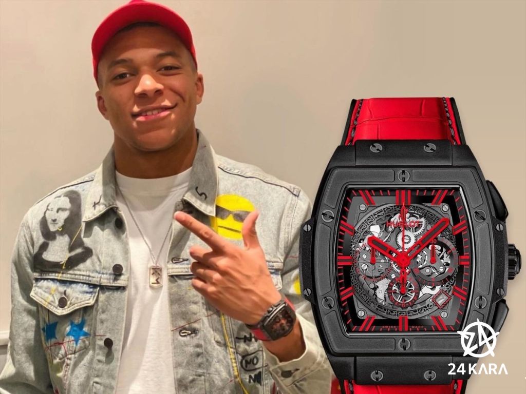 Mbappe với phong cách thời trang kết hợp áo denim vẽ graffiti và đồng hồ Hublot Spirit Of Big Bang 45mm cùng màu với mũ đỏ anh đang đội. Chiếc đồng hồ làm từ gốm đen với núm vặn bằng titanium và mặt số lộ khung. Mức giá của chiếc đồng hồ này là 26.600 USD (khoảng hơn 638 triệu đồng).
